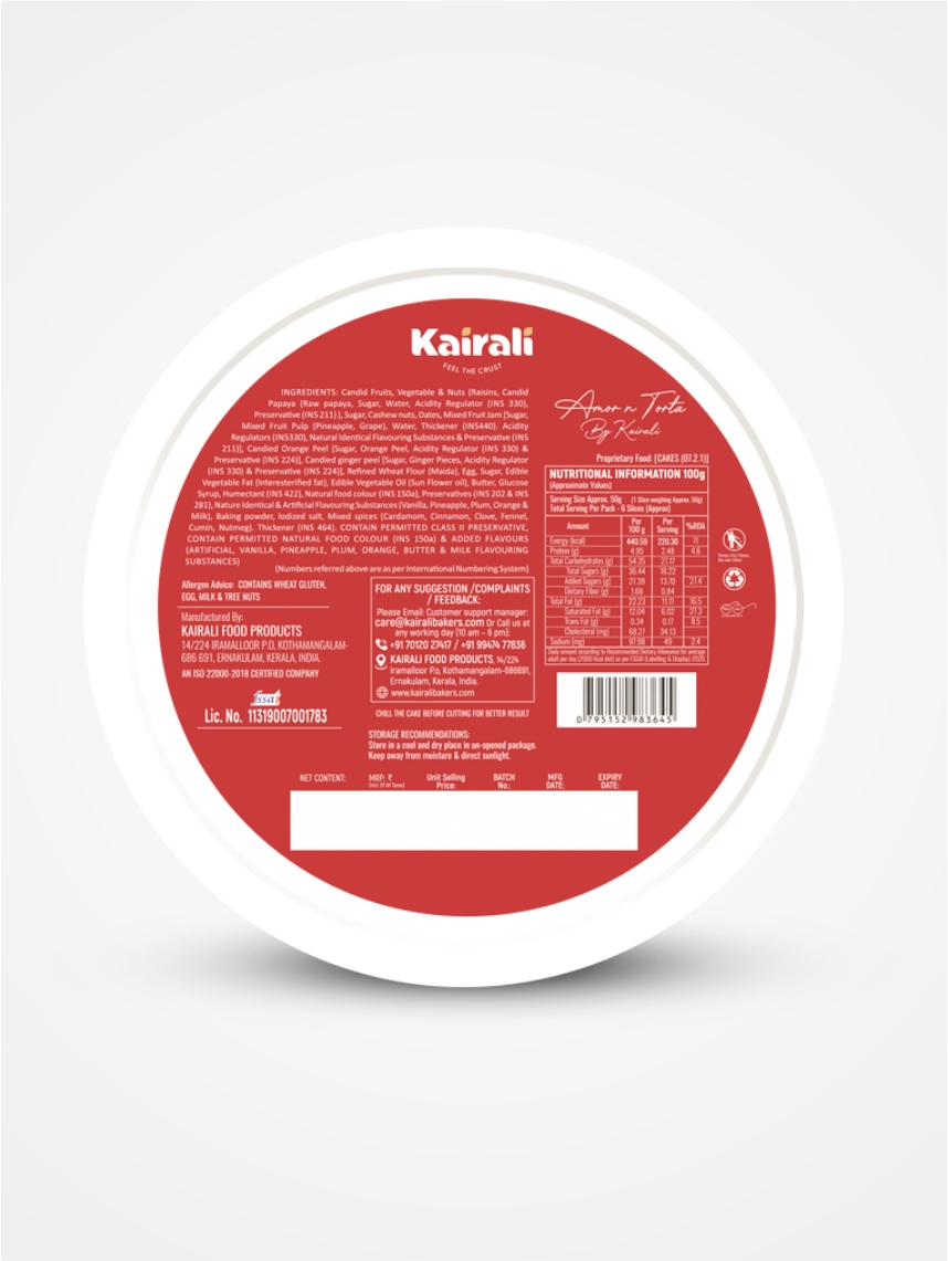 Candid Fruits, Vegetable & Nuts ( Raisins, Candid Papaya{ Raw papaya, Sugar, Water, Acidity Regulator (INS 330), Preservative (INS 211) }, Sugar, Cashew nuts, Dates, Mixed Fruit Jam[Sugar, Mixed Fruit Pulp(Pineapple, Grape), Water, Thickener (INS440), Acidity Regulators(INS330), Natural Identical Flavouring Substances & Preservative (INS 211)], Candied Orange Peel[ Sugar, Orange Peel, Acidity Regulator (INS 330) And Preservative (INS 224) ], Candied ginger peel [ Sugar, Ginger Pieces, Acidity Regulator (INS 330) & Preservative (INS 224) ], Refined Wheat Flour (Maida), Egg, Sugar, Edible Vegetable Fat (Interesterified fat), Edible Vegetable Oil (Sun Flower oil), Butter, Glucose Syrup, Humectant (INS 422 ), Natural food colour (INS 150a), Preservatives (INS 202 & INS 281), Nature Identical & Artificial Flavouring Substances { Vanilla, Pineapple, Plum, Orange, & Milk ), Baking powder, lodized salt, Mixed spices {Cardamom, Cinnamon, Clove, Fennel, Cumin, Nutmeg}. Thickener (INS 464),