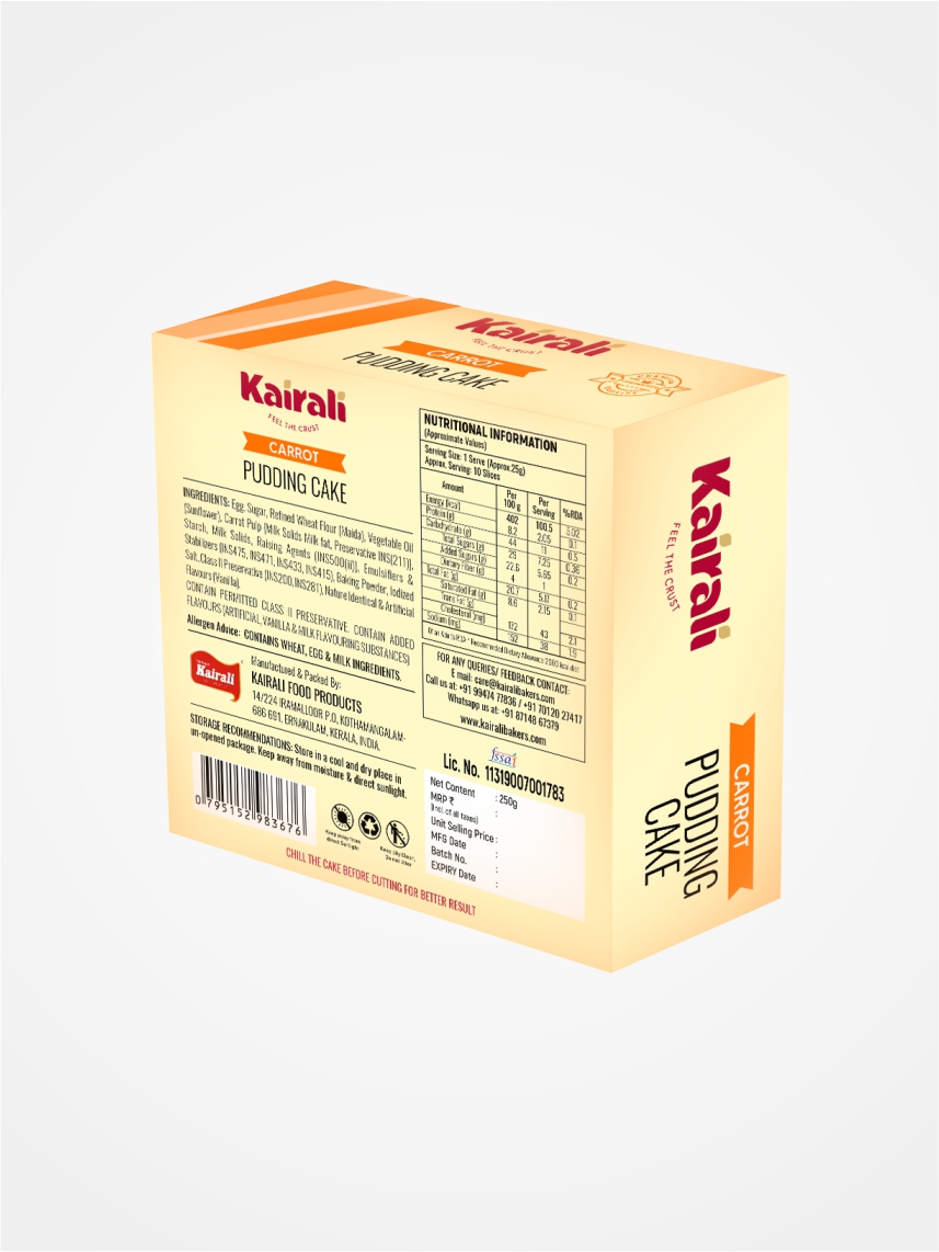 Egg, Sugar, Refined Wheat Flour (Maida), Vegetable Oil (Sunflower), Carrot Pulp {Milk Solids Milk fat, Preservative \{NS(211)\} Starch, Milk Solids, Raising Agents (INS500(ii)), Emulsifiers & Stabilizers (INS475, INS471, INS433, INS415), Baking Powder, lodized Salt, Class II Preservative (INS200, INS281), Nature Identical & Artificial Flavours (Vanilla).